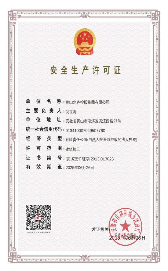 安全生產(chǎn)許可證是建筑業(yè)施工企業(yè)進行生產(chǎn)、施工等必備的一個證件,6月6日,黃山水務控股集團有限公司《安全生產(chǎn)許可證》順利通過上級主管部門審核,完成復審。